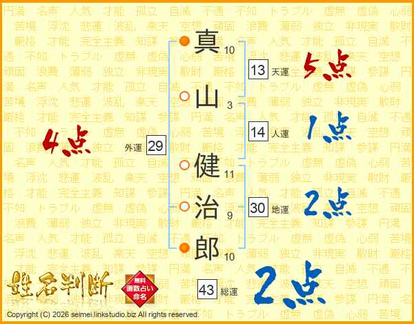 真(10画)山(3画) 健(11画)治(9画)郎(10画)