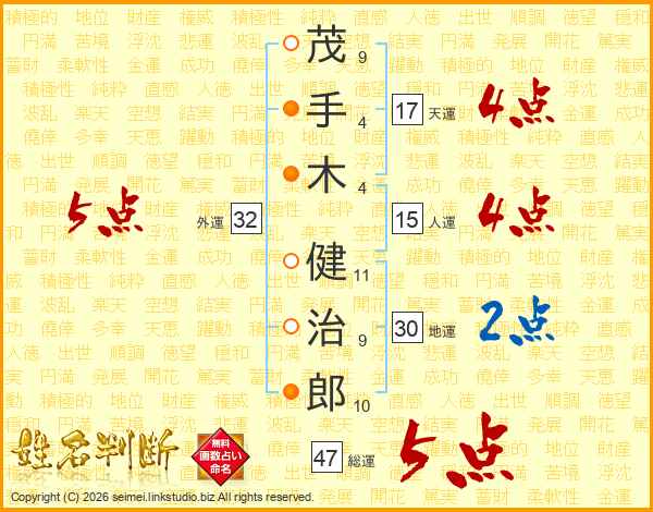 茂(9画)手(4画)木(4画) 健(11画)治(9画)郎(10画)