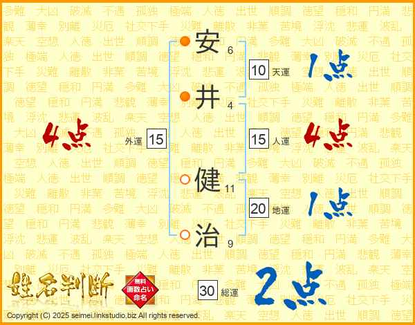 あなたの人生を表す1番重要な運勢です。生涯を通じて影響する総合運となり、主に50歳以降の晩年期に影響を及ぼします。苗字と名前の合計画数。