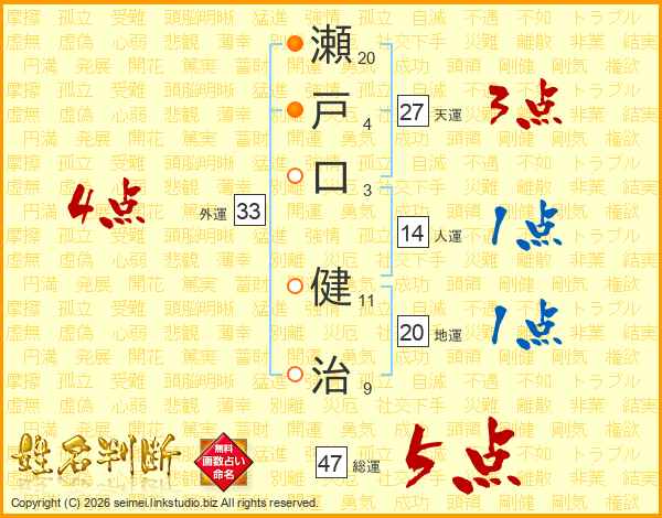 瀬(20画)戸(4画)口(3画) 健(11画)治(9画)
