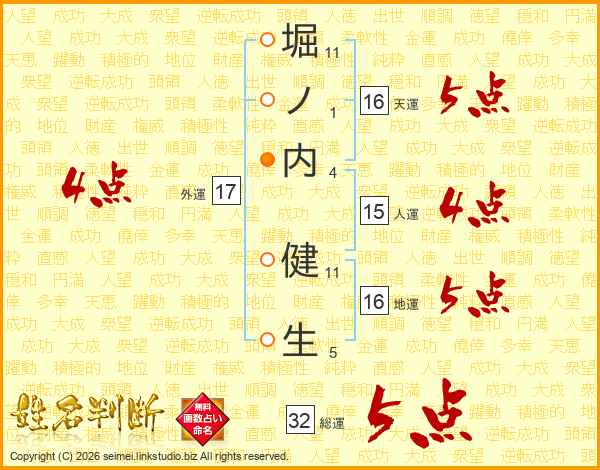 堀(11画)ノ(1画)内(4画) 健(11画)生(5画)