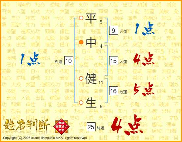 平(5画)中(4画) 健(11画)生(5画)