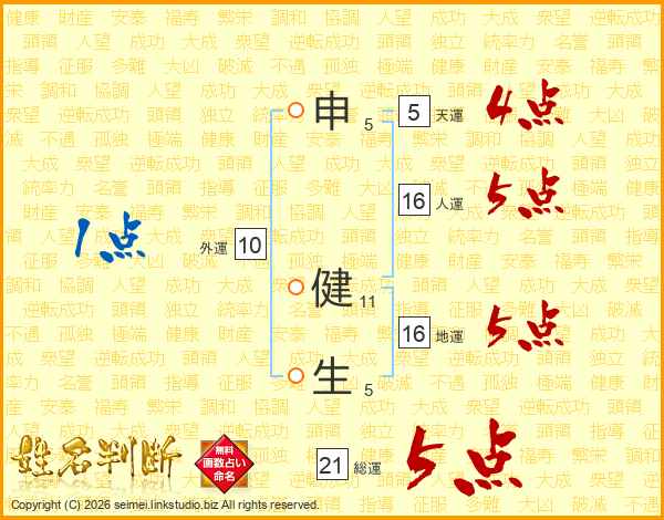 あなたの人生を表す1番重要な運勢です。生涯を通じて影響する総合運となり、主に50歳以降の晩年期に影響を及ぼします。苗字と名前の合計画数。