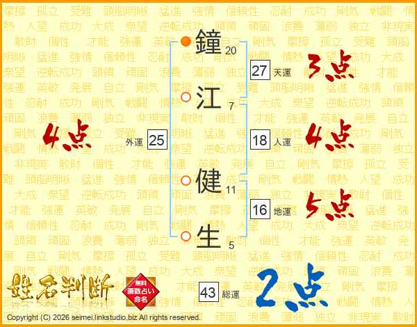 あなたの人生を表す1番重要な運勢です。生涯を通じて影響する総合運となり、主に50歳以降の晩年期に影響を及ぼします。苗字と名前の合計画数。