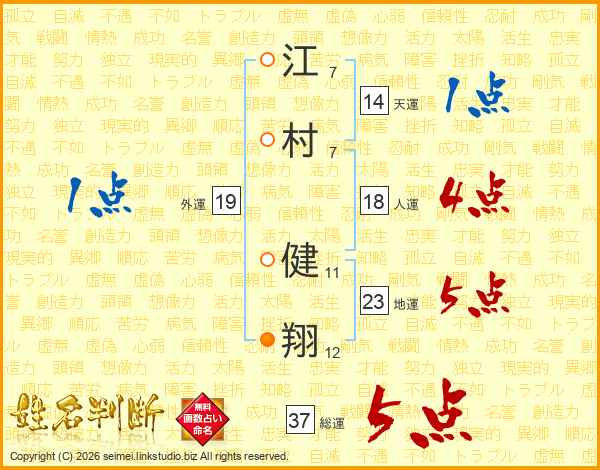 生活面を象徴する運勢です。外部から受ける影響力を表し、結婚運、家庭運や職場、環境への順応性を表します。総運から人運を引いた画数。姓や名が1文字の場合を除く。