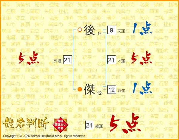後傑さんの総運は21画の5点!