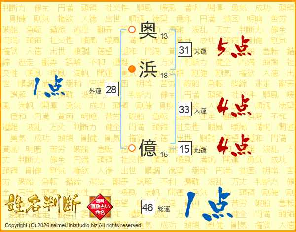 生活面を象徴する運勢です。外部から受ける影響力を表し、結婚運、家庭運や職場、環境への順応性を表します。総運から人運を引いた画数。姓や名が1文字の場合を除く。