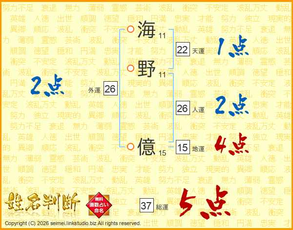 海野億さんの総運は37画の5点!