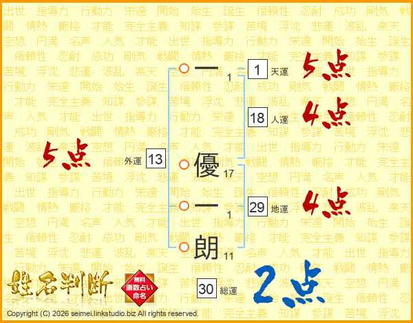 あなたの人生を表す1番重要な運勢です。生涯を通じて影響する総合運となり、主に50歳以降の晩年期に影響を及ぼします。苗字と名前の合計画数。