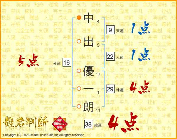 中(4画)出(5画) 優(17画)一(1画)朗(11画)