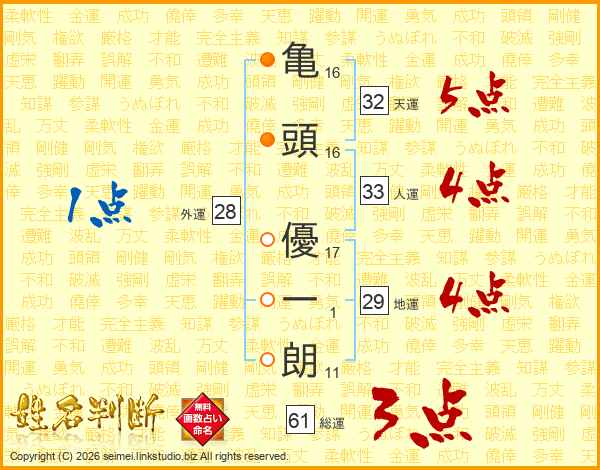 亀(16画)頭(16画) 優(17画)一(1画)朗(11画)