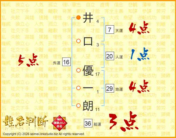 井(4画)口(3画) 優(17画)一(1画)朗(11画)