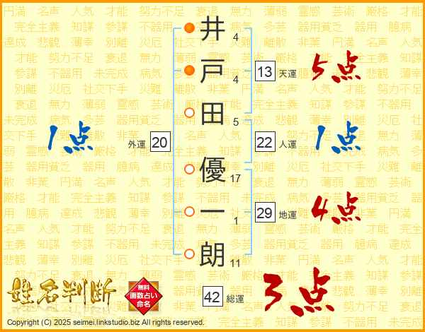 井(4画)戸(4画)田(5画) 優(17画)一(1画)朗(11画)