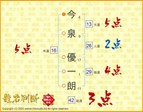 今(4画)泉(9画) 優(17画)一(1画)朗(11画)