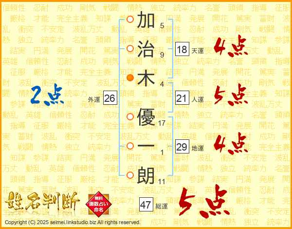 加(5画)治(9画)木(4画) 優(17画)一(1画)朗(11画)