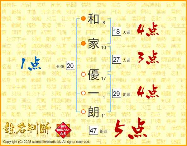和(8画)家(10画) 優(17画)一(1画)朗(11画)