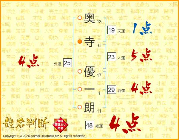 奥(13画)寺(6画) 優(17画)一(1画)朗(11画)