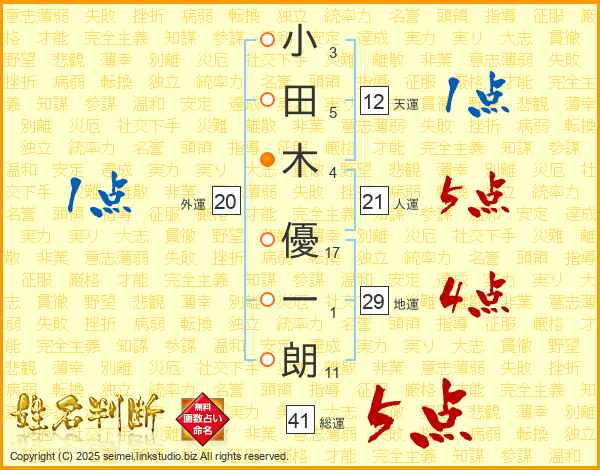 小田木優一朗さんの総運は41画の5点!