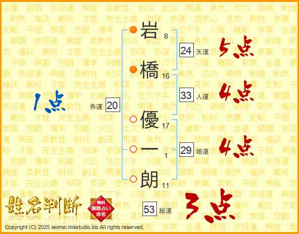 岩(8画)橋(16画) 優(17画)一(1画)朗(11画)