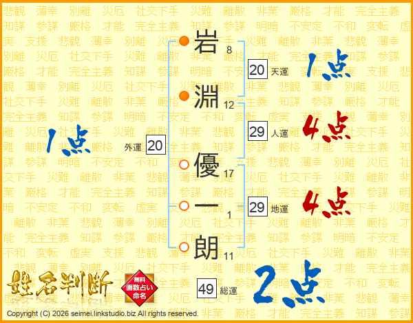岩(8画)淵(12画) 優(17画)一(1画)朗(11画)