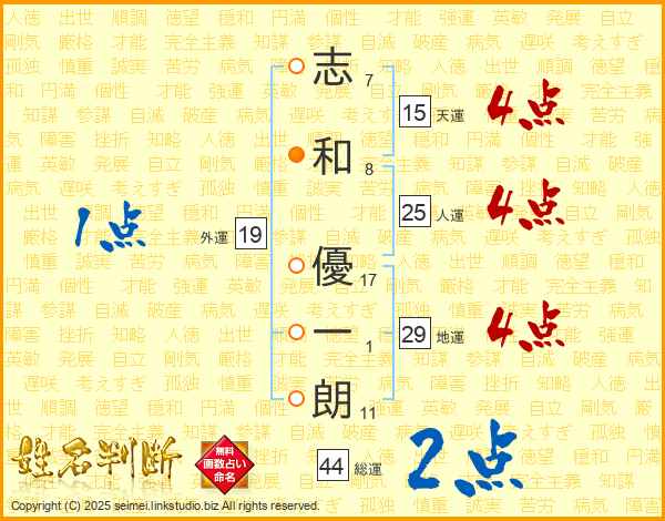 志(7画)和(8画) 優(17画)一(1画)朗(11画)