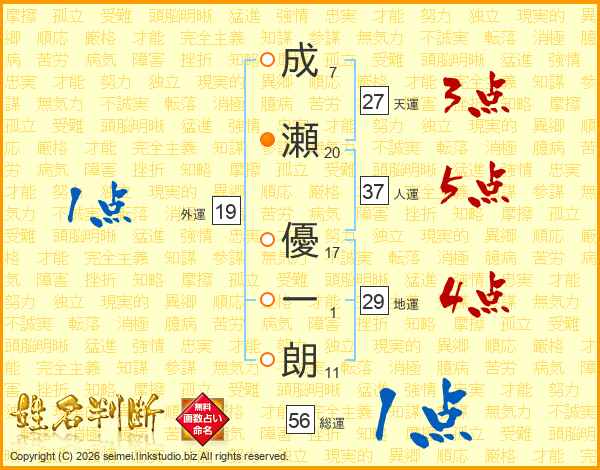 成(7画)瀬(20画) 優(17画)一(1画)朗(11画)