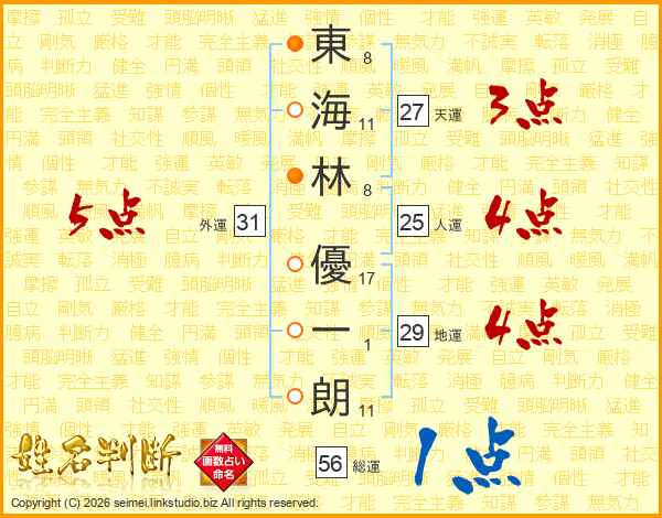 東(8画)海(11画)林(8画) 優(17画)一(1画)朗(11画)