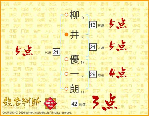 柳(9画)井(4画) 優(17画)一(1画)朗(11画)