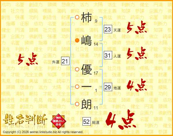 柿(9画)嶋(14画) 優(17画)一(1画)朗(11画)