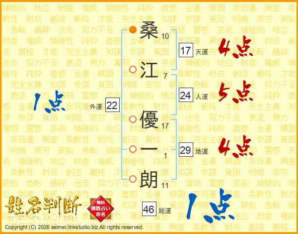桑(10画)江(7画) 優(17画)一(1画)朗(11画)