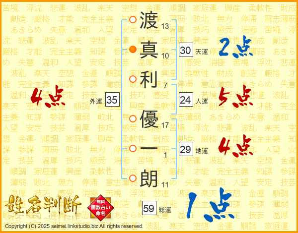 渡(13画)真(10画)利(7画) 優(17画)一(1画)朗(11画)