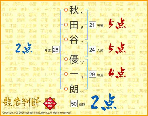 秋(9画)田(5画)谷(7画) 優(17画)一(1画)朗(11画)