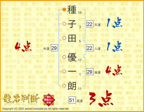 種(14画)子(3画)田(5画) 優(17画)一(1画)朗(11画)