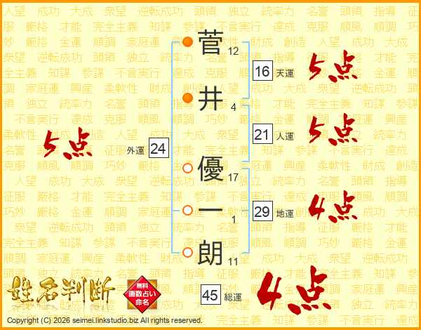 菅(12画)井(4画) 優(17画)一(1画)朗(11画)