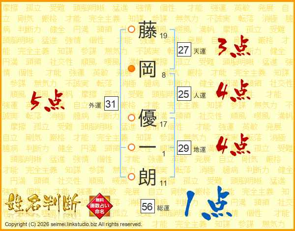 藤(19画)岡(8画) 優(17画)一(1画)朗(11画)
