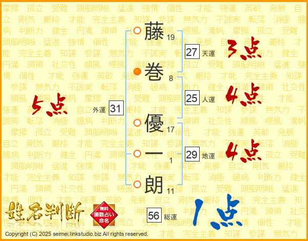藤(19画)巻(8画) 優(17画)一(1画)朗(11画)
