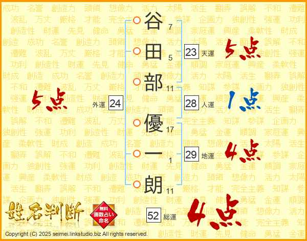 谷(7画)田(5画)部(11画) 優(17画)一(1画)朗(11画)