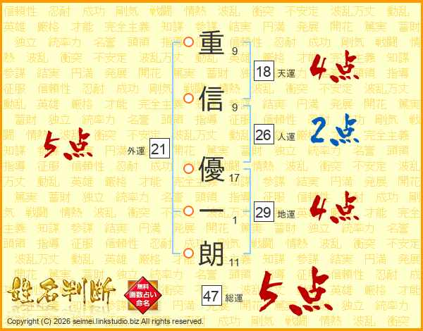 重(9画)信(9画) 優(17画)一(1画)朗(11画)