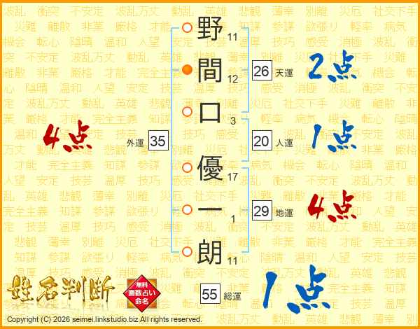 野(11画)間(12画)口(3画) 優(17画)一(1画)朗(11画)