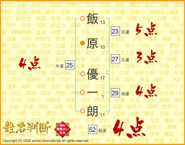 飯(13画)原(10画) 優(17画)一(1画)朗(11画)