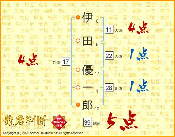 伊田優一郎さんの総運は39画の5点!