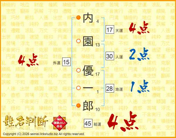 内(4画)園(13画) 優(17画)一(1画)郎(10画)