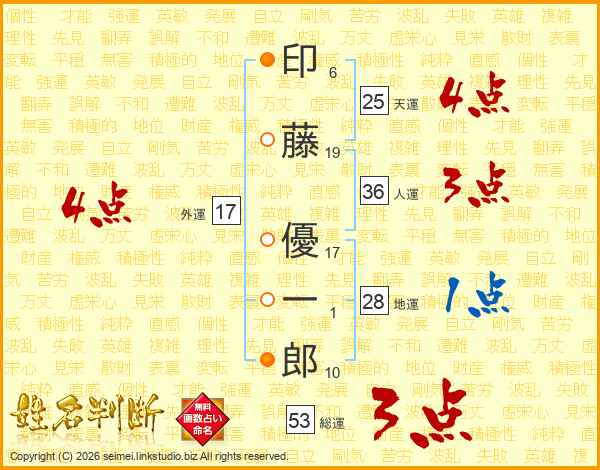 印(6画)藤(19画) 優(17画)一(1画)郎(10画)