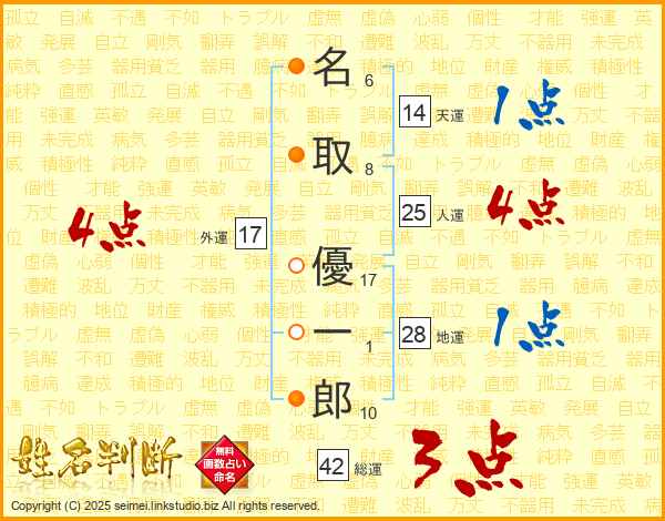名(6画)取(8画) 優(17画)一(1画)郎(10画)