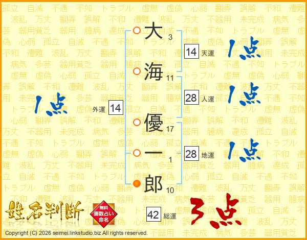大(3画)海(11画) 優(17画)一(1画)郎(10画)