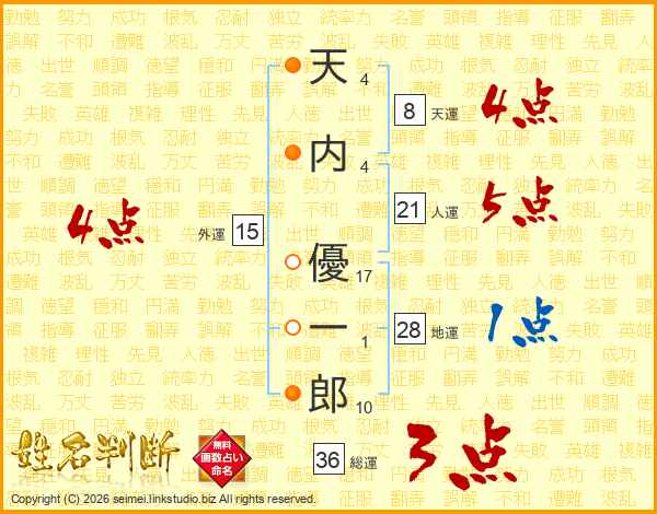 天(4画)内(4画) 優(17画)一(1画)郎(10画)