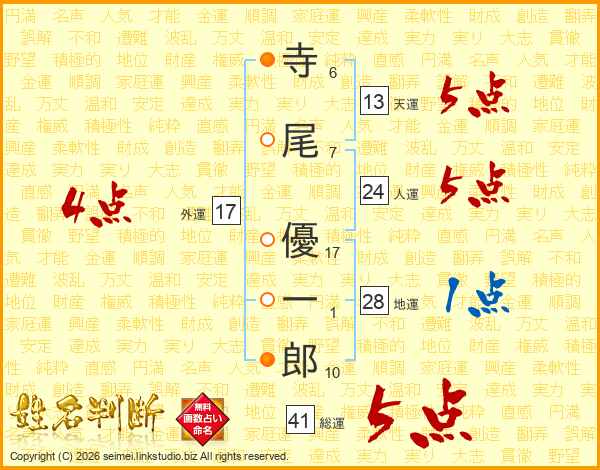 寺(6画)尾(7画) 優(17画)一(1画)郎(10画)