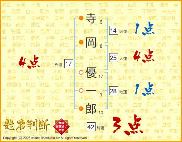 寺(6画)岡(8画) 優(17画)一(1画)郎(10画)