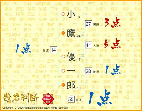 小(3画)鷹(24画) 優(17画)一(1画)郎(10画)
