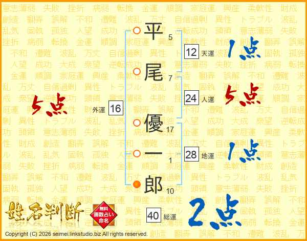 平(5画)尾(7画) 優(17画)一(1画)郎(10画)